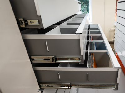 Стеллажи с выдвижными металлическими ящиками и полками помогут упорядочить все документы и организовать эффективное рабочее пространство.