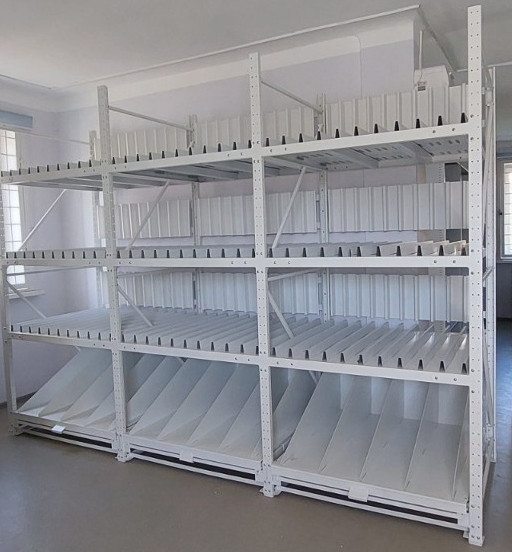 Гребенчатые стеллажи оснащены специальными разделителями образующими систему ячеек разного размера, обеспечивающими надежную фиксацию и защиту от повреждений и царапин. Такая конструкция позволяет удобно размещать рамы, картины или иконы различного размера, обеспечивая торцевое хранение и легкий доступ для их осмотра или реставрации.