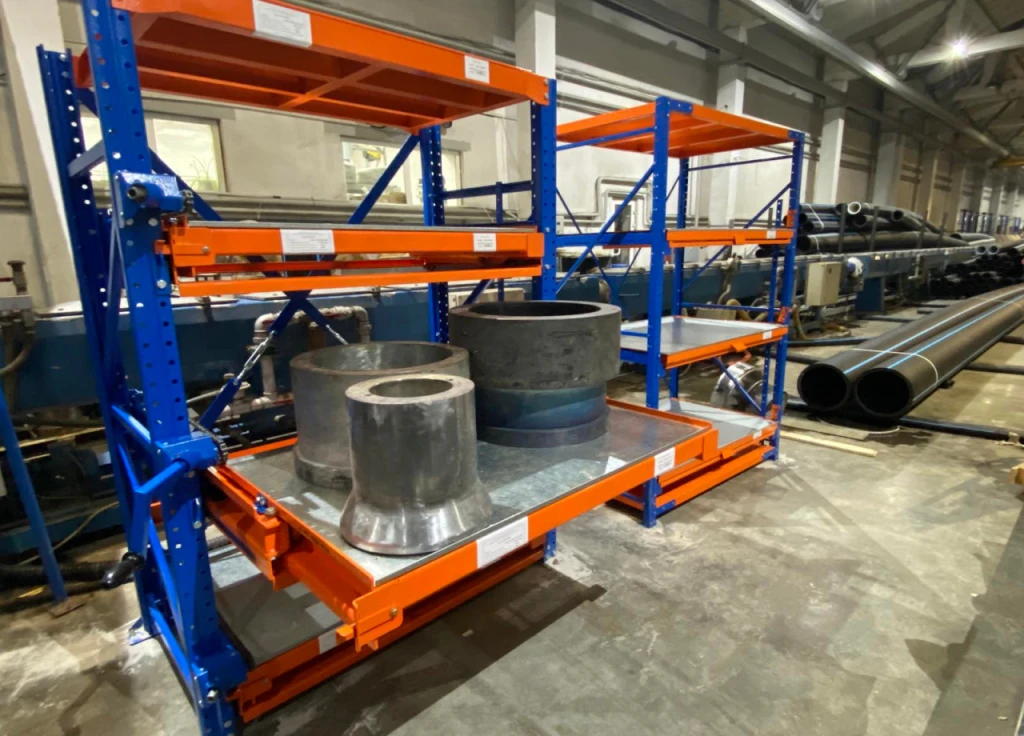 Стеллажи для тяжелых грузов весом до 1000 кг с полками частичного выдвижения и механизмом безопасности от одновременного выдвижения. Для облегчения работы могут комплектоваться талью.